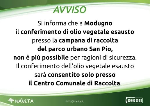 Si informa che a Modugno il conferimento di olio vegetale esausto presso la campana di raccolta del parco urbano di San Pio, non è più possibile per ragioni di sicurezza.