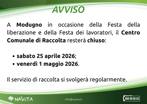 CHIUSURA FESTIVITÀ 25 APRILE E 1 MAGGIO 2026 – MODUGNO