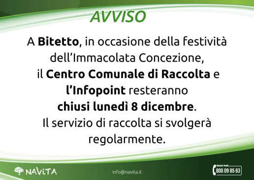 A Bitetto, in occasione della festività dell’Immacolata Concezione, il Centro Comunale di Raccolta e l’Infopoint resteranno chiusi lunedì 8 dicembre.