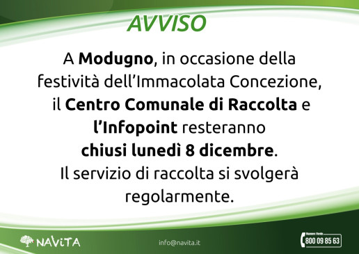 A Modugno, in occasione della festività dell’Immacolata Concezione, il Centro Comunale di Raccolta e l’Infopoint resteranno chiusi lunedì 8 dicembre.
