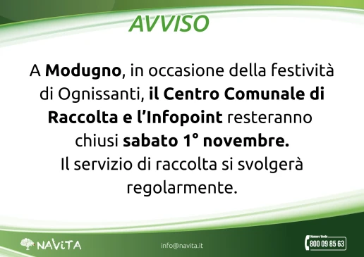 A Modugno, in occasione della festività di Ognissanti, il Centro Comunale di Raccolta e l’Infopoint resteranno chiusi sabato 1° novembre.
