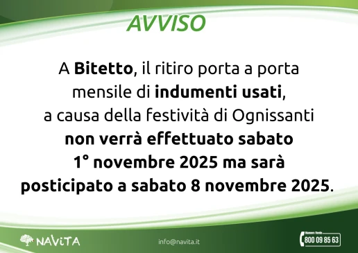 A Bitetto, il ritiro porta a porta mensile di indumenti usati, a causa della festività di Ognissanti non verrà effettuato sabato 1° novembre 2025 ma sarà posticipato a sabato 8 novembre 2025.